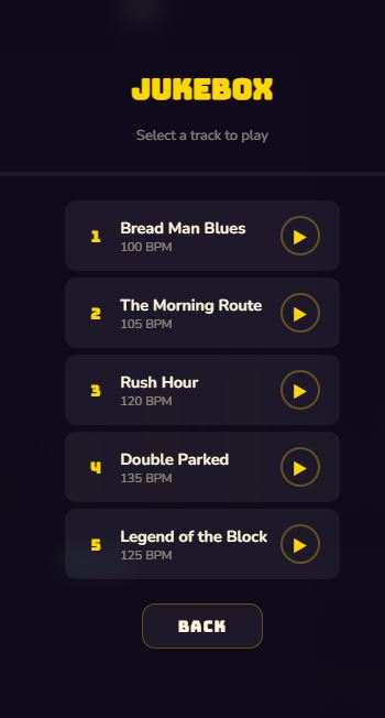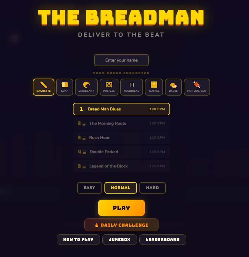 A rhythm game where you deliver bread to the beat. 5 original tracks, 8 bread characters to choose from, 3 difficulty levels, daily challenges, and a leaderboard.